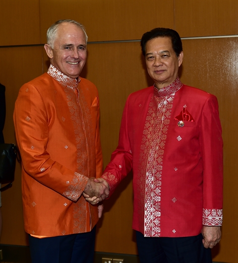 | Le Premier ministre vietnamien Nguyên Tân Dung et son homologue australien Malcom Turnbull, le 21 novembre à Kuala Lumpur (Malaisie). |