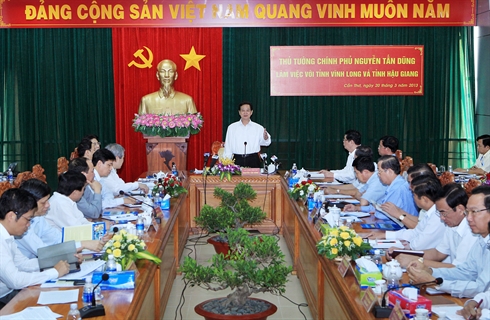| Le Premier ministre Nguyên Tân Dung a travaillé, le 20 mars à Cân Tho, avec des responsables des provinces de Vinh Long et Hâu Giang. Photo: Duc Tam/VNA/CVN |