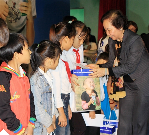 | La vice-présidente de la République, Nguyên Thi Doan, remisent des bourses d’études à des enfants en difficultés dans le district insulaire de Ly Son, province de Quang Ngai (Centre). |