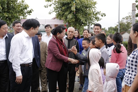 | La présidente de l’Assemblée nationale Nguyên Thi Kim Ngân (centre) et des habitants locaux du hameau Sen N°3, le 19 novembre à Nghê An (Centre). |