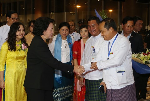 | La présidente de l’Assemblée nationale Nguyên Thi Kim Ngân (droite), à l'aéroport international de Nay Pyi Taw, le 28 septembre au Myanmar. |