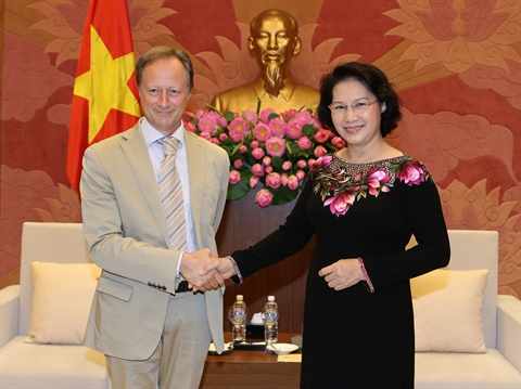 | La présidente de l’Assemblée nationale vietnamienne Nguyên Thi Kim Ngân et l’ambassadeur d’Allemagne au Vietnam, Christian Berger, le 17 juin à Hanoi. |