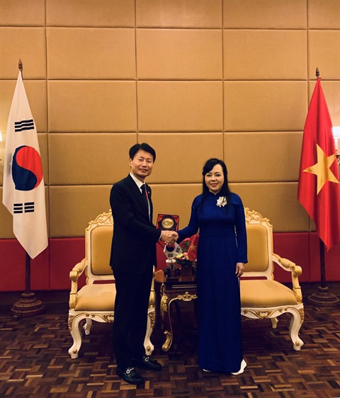 | La ministre de la Santé, Nguyên Thi Kim Tiên, et le le vice-ministre sud-coréen de la Santé et du Bien-être social, Kim Ganglip. |