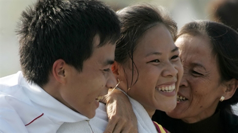 | Nguyên Thi Thanh Phúc (centre), Thành Ngung (gauche) et leur mère aux anges après cette performance éblouissante. Photo : CTV/CVN |