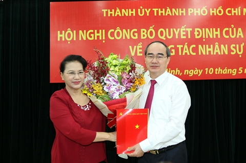 | La présidente de l'Assemblée nationale Nguyên Thi Kim Ngân remet la décision du politburo du PCV au nouveau secrétaire du Comité du Parti pour Hô Chi Minh-Ville, Nguyên Thiên Nhân, le 10 mai dans la mégapole du Sud. |