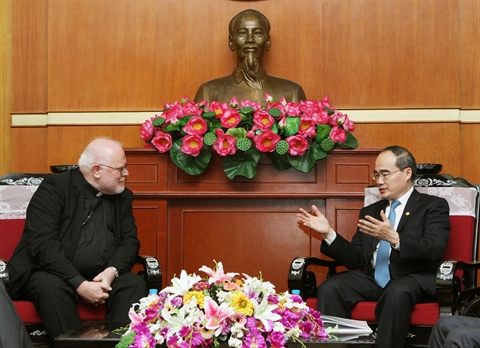 | Le président du Front de la Patrie du Vietnam, Nguyên Thiên Nhân (droite), et le cardinal Marx, président du Conseil épiscopal allemand, |