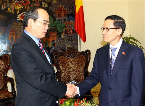 | Le vice-Premier ministre Nguyên Thiên Nhân (gauche) et l'ancien Premier ministre thaïlandais et conseiller de haut rang du Parti Pheu Thai (PTP), Somchai Wongsawat, le 2 octobre à Hanoi. |