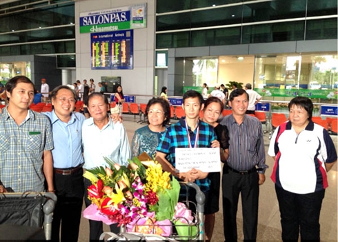 | Nguyên Tiên Minh (centre) est chaleureusement accueilli à l’aéroport de Tân Son Nhât (Hô Chi Minh-Ville) après sa belle victoire aux Championnats mondiaux 2013. |