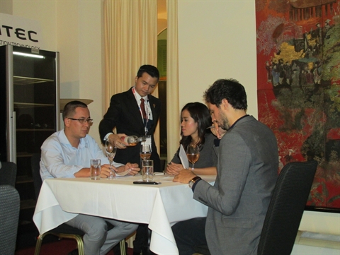 | Nguyên Tiên Thinh (comple noir) présente un vin rosé français à ses invités. |