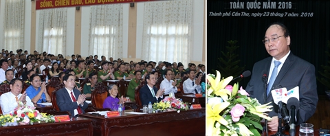 | Le Premier ministre Nguyên Xuân Phuc (au micro) à la conférence nationale réunissant des personnes méritantes de la Révolution vietnamienne, le 23 juillet à Cân Tho. |