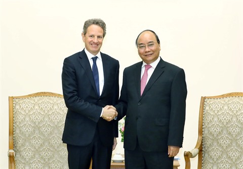 | Le Premier ministre Nguyên Xuân Phuc (droite) et le président de Warburg Pincus, Tim Geithner, le 7 mai à Hanoï. |