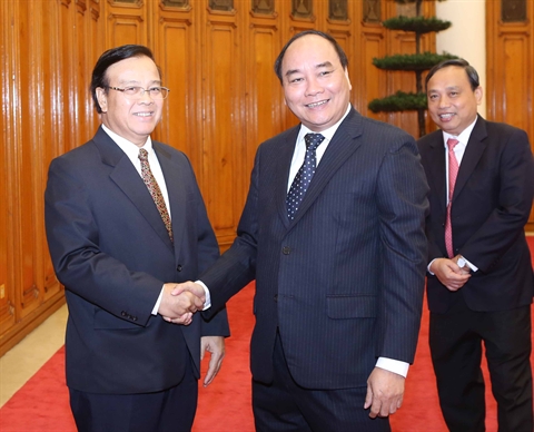 | Le vice-Premier ministre Nguyên Xuân Phuc (droite) serre la main le 10 septembre à Hanoi au ministre lao du Plan et de l’Investissement, Somdy Douangdy. |