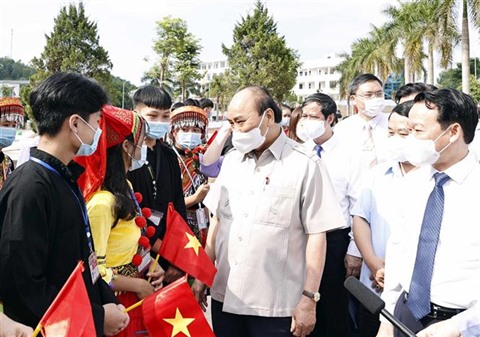 | Le président Nguyên Xuân Phuc lors de sa visite à l'école-internat des ethnies minoritaires de la province montagneuse de Yên Bai, le 7 septembre. |