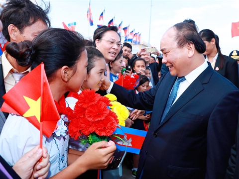 | Le Premier ministre Nguyên Xuân Phuc (droite) à l’aéroport international de Pochentong à Phnom Penh, le 24 avril. |