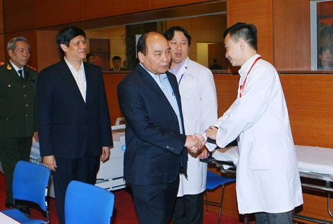 | Le vice-Premier ministre Nguyên Xuân Phuc (centre), s’est rendu le 27 mars au Centre national des conférences de My Dinh, à Hanoi, pour contrôler la préparation en termes de sécurité et de santé |
