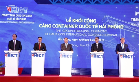 | Nguyên Xuân Phuc (centre) au lancement des travaux de construction du port international à conteneurs de Hai Phong, le 12 mai. |