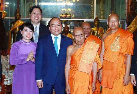 | Le Premier ministre Nguyên Xuân Phuc (2e à gauche) et son épouse rendent visite au Bonze supérieur Tep Vong (3e à gauche), le 25 avril au Cambodge. |