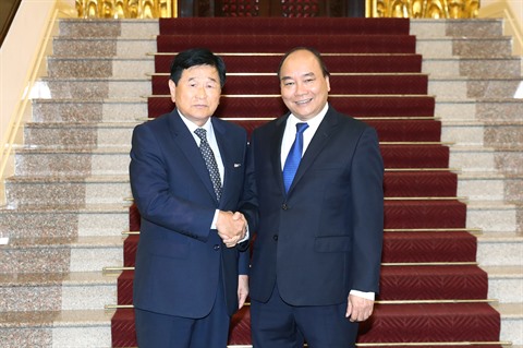 | Le Premier ministre vietnamien Nguyên Xuân Phuc (droite) et l'ancien gouverneur de la ville sud-coréenne d’Osan, Park Shin-won, le 29 août à Hanoï. |