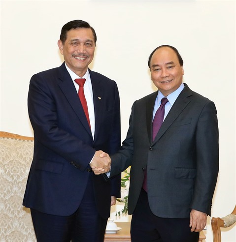| Le PM vietnamien Nguyên Xuân Phuc (droite) et le ministre coordinateur des Affaires maritimes de l’Indonésie, Luhut Binsar Pandjaitan. |