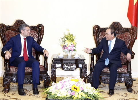| Le Premier ministre Nguyên Xuân Phuc (droite) a reçu, mardi 26 avril à Hanoi, le directeur exécutif et chef de la banque d’investissement Goldman Sachs Asia, Andrea Vella. |