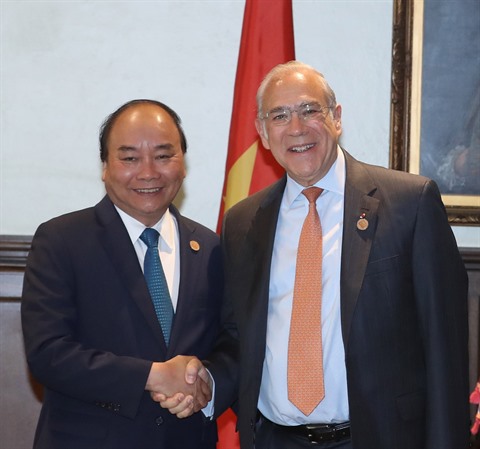 | Le Premier ministre vietnamien Nguyên Xuân Phuc (gauche) et le secrétaire général de l'Organisation de coopération et de développement économiques (OCDE), Angel Gurria. |
