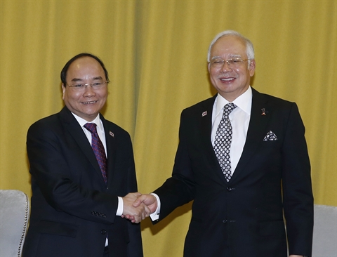 | Le PM vietnamien Nguyên Xuân Phuc (gauche) et son homologue malais Najib Rajak, |