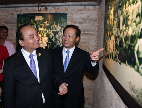 | Le Premier ministre Nguyên Xuân Phuc (gauche) à l'école de Yucai de Nanning, le 11 septembre dans la province chinoise du Guangxi. |