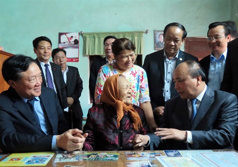 | Le Premier ministre Nguyên Xuân Phuc (1er plan, à droite) et la mère héroïne Lê Thi Tri (92 ans), le 22 janvier dans la province de Quang Nam (Centre). |
