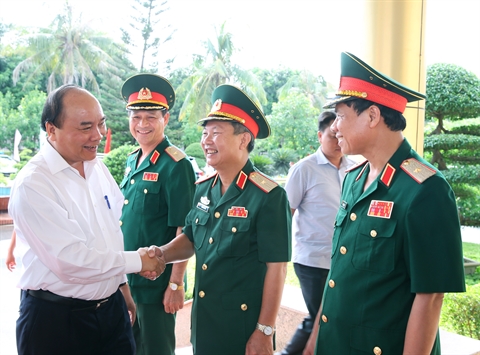| Le Premier ministre Nguyên Xuân Phuc avec le commandant, les officiers, cadres et soldats de la IVe zone militaire, le 14 août. |