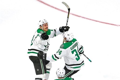 | La joie de Roope Hint et Denis Gurianov (droite) après le but de la victoire des Dallas Stars sur les Vegas Golden Knights à Edmonton, le 14 septembre. |