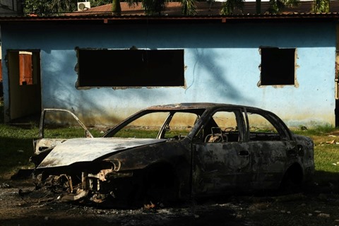 | Un commissariat de police incendié par les manifestants à Diriamba, à 40 km de Managua, le 14 juin 2018. |