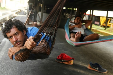 | Des chauffeurs de camion se reposent sous leur camion en attendant la levée d'un barrage par les manifestants à Diriamba, à 40 km de Managua, le 14 juin. |