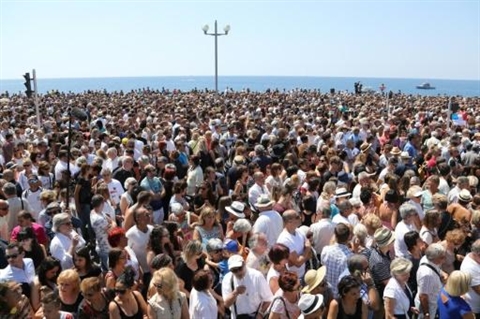 | Les gens sont réunis le 18 juillet sur la Promenade des Anglais, à Nice, pour une minute de silence en hommage aux victimes de l'attentat qui y a fait 84 morts. |