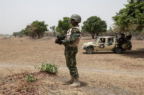 | Des soldats nigériens montent la garde à la frontière avec le Nigeria, le 25 avril 2017. |