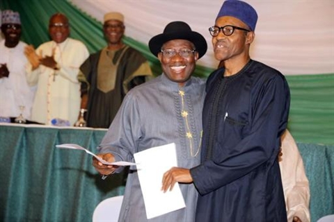 | Le président nigérian Goodluck Jonathan (gauche) et son principal opposant Mohammadu Buhari le 26 mars 2015 à Abuja. |