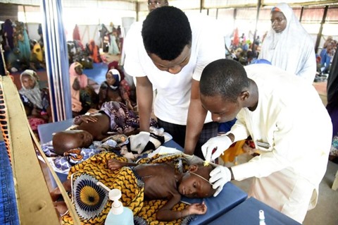 | Des médecins auscultent des enfants souffrant de malnutrition, dans l'État de Katsina, le 20 juillet. |
