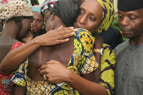 | Le vice-président du Nigeria Yemi Osinbajo (droite) regarde sa femme Dolapo (centre) consoler l'une des 21 jeunes filles de Chibok libérées, le 13 octobre à Abuja. |