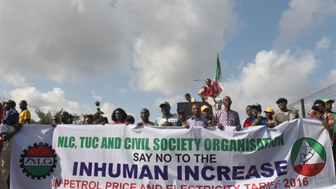 | Manifestation de Nigérians le 18 mai 2016 à Lagos pour réclamer une stabilisation des prix de l'essence. |
