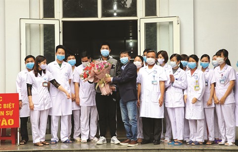| Le directeur du Centre de contrôle des maladies de Ninh Binh, Lê Hoàng Nam (veste bleue), congratule un homme guéri du COVID-19. |