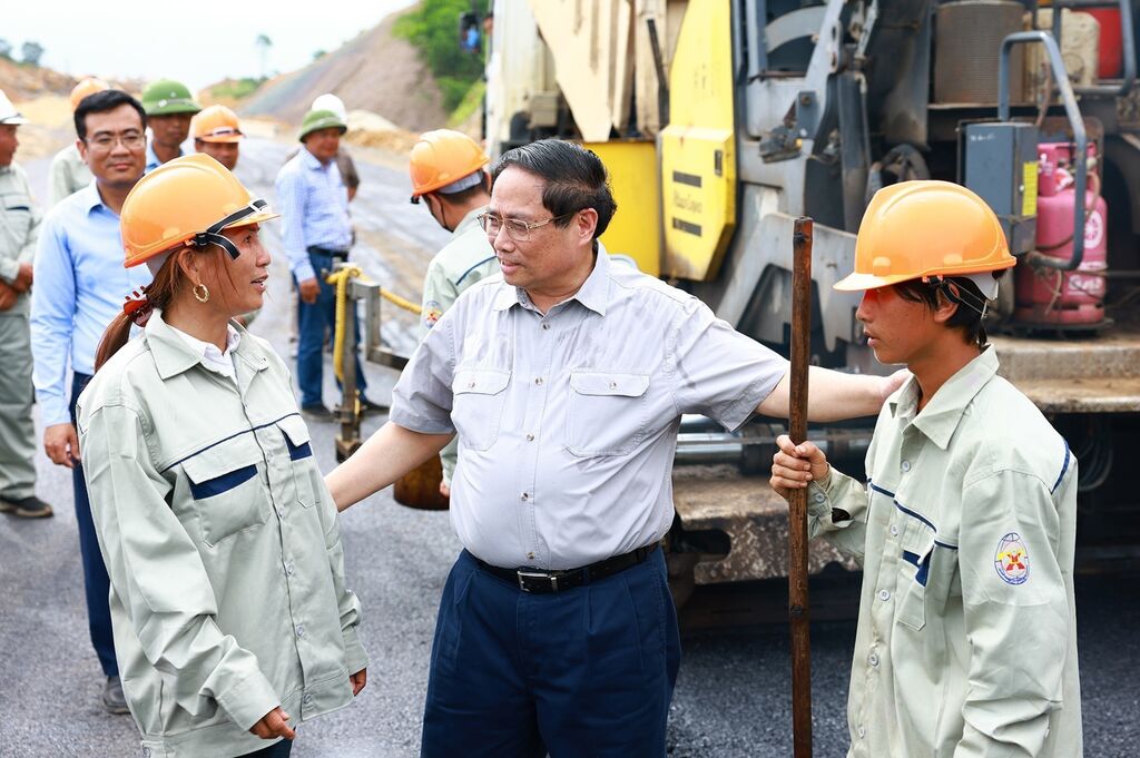| Le Premier ministre Pham Minh Chinh (centre) discute avec les travailleurs sur le chantier du projet de route Est-Ouest à Ninh Binh. |