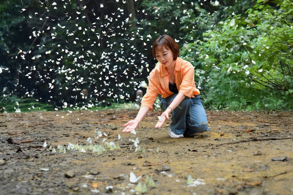 | Une touriste s'amuse avec des papillons dans le Parc national de Cuc Phuong, province de Ninh Binh (Nord). |