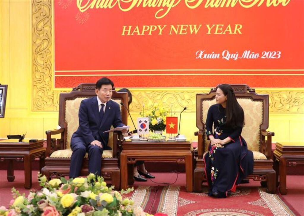 La secrétaire du Comité du Parti de Ninh Binh, Nguyên Thi Thu Hà, a informé le président de l'Assemblée nationale sud-coréenne, Kim Jin-pyo, du développement socio-économique de sa province en 2022 dont une impressionnante croissance de 8,62%.