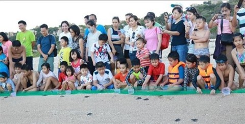 | Les élèves participant au lâcher des petites tortues dans la mer au parc national de Nui Chua. |