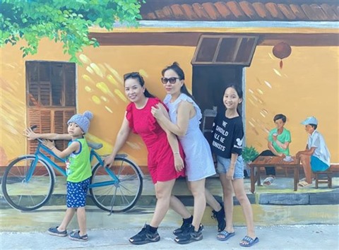 | Touristes au village des fresques murales de Hon Thiên (district de Ninh Hai, province de Ninh Thuân). |