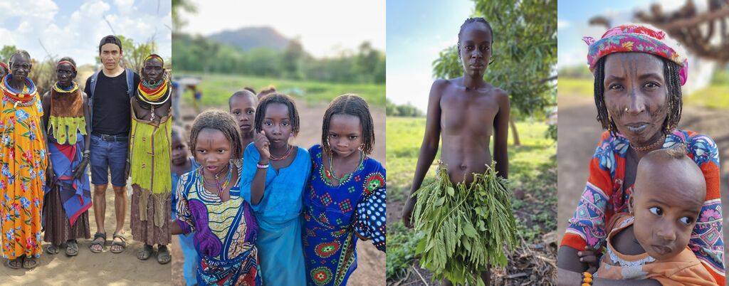 | Noah Nguyên lors d'une rencontre avec des femmes et des enfants de la tribu Mursi, dans la vallée de l’Omo, en Éthiopie. |