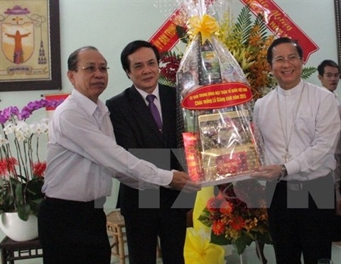 | Le vice-président du CC du FPV, Lê Ba Trinh (milieu), remet des cadeaux au Mgr Giuse Nguyên Tân Tuoc (droite), évêque du diocèse de Phu Cuong |