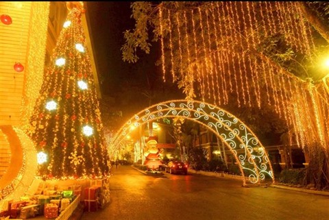 | Une rue de Hai Phong (Nord) décorée à l'occasion de Noël. |