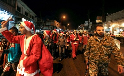 | Des Syriens habillés en Père Noël déambulent dans les rues de Damas escortés par des militaires, le 24 décembre. |