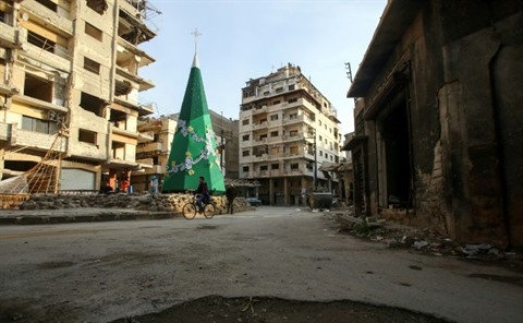 | Un sapin de Noël se dresse au milieu des destructions dans la vieille ville syrienne de Homs, le 17 décembre. |