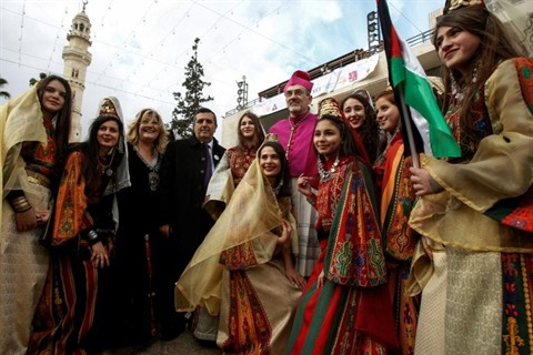 | L'archevêque Pierbattista Pizzaballa avec des Palestiniennes en habit traditionnel pour fêter Noël sur la place de la Mangeoire devant l'église de la Nativité à Bethléem, le 24 décembre. |